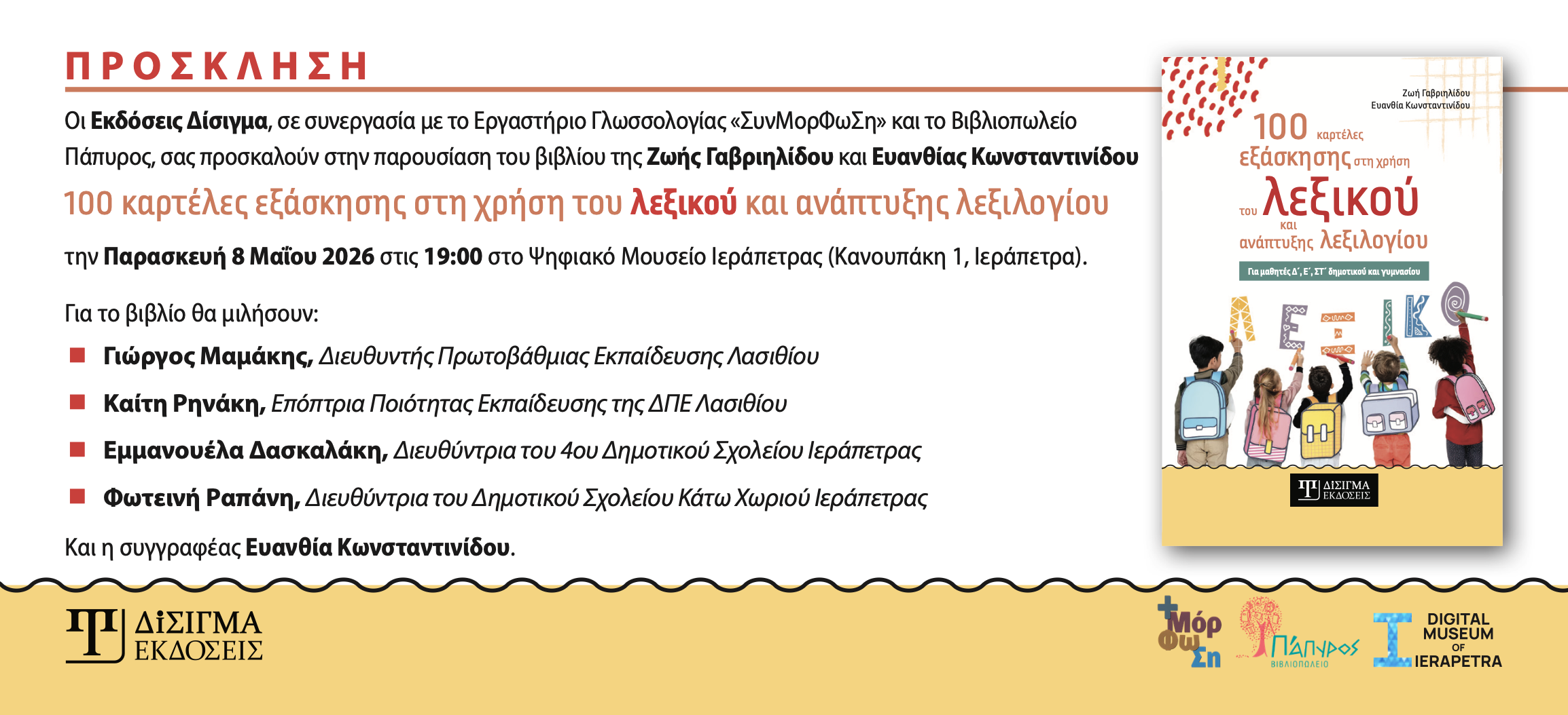 Οι Εκδόσεις Δίσιγμα, σε συνεργασία με το Εργαστήριο Γλωσσολογίας «ΣυνΜορΦωΣη» και το Βιβλιοπωλείο Πάπυρος, σας προσκαλούν στην παρουσίαση του βιβλίου της Ζωής Γαβριηλίδου και Ευανθίας Κωνσταντινίδου