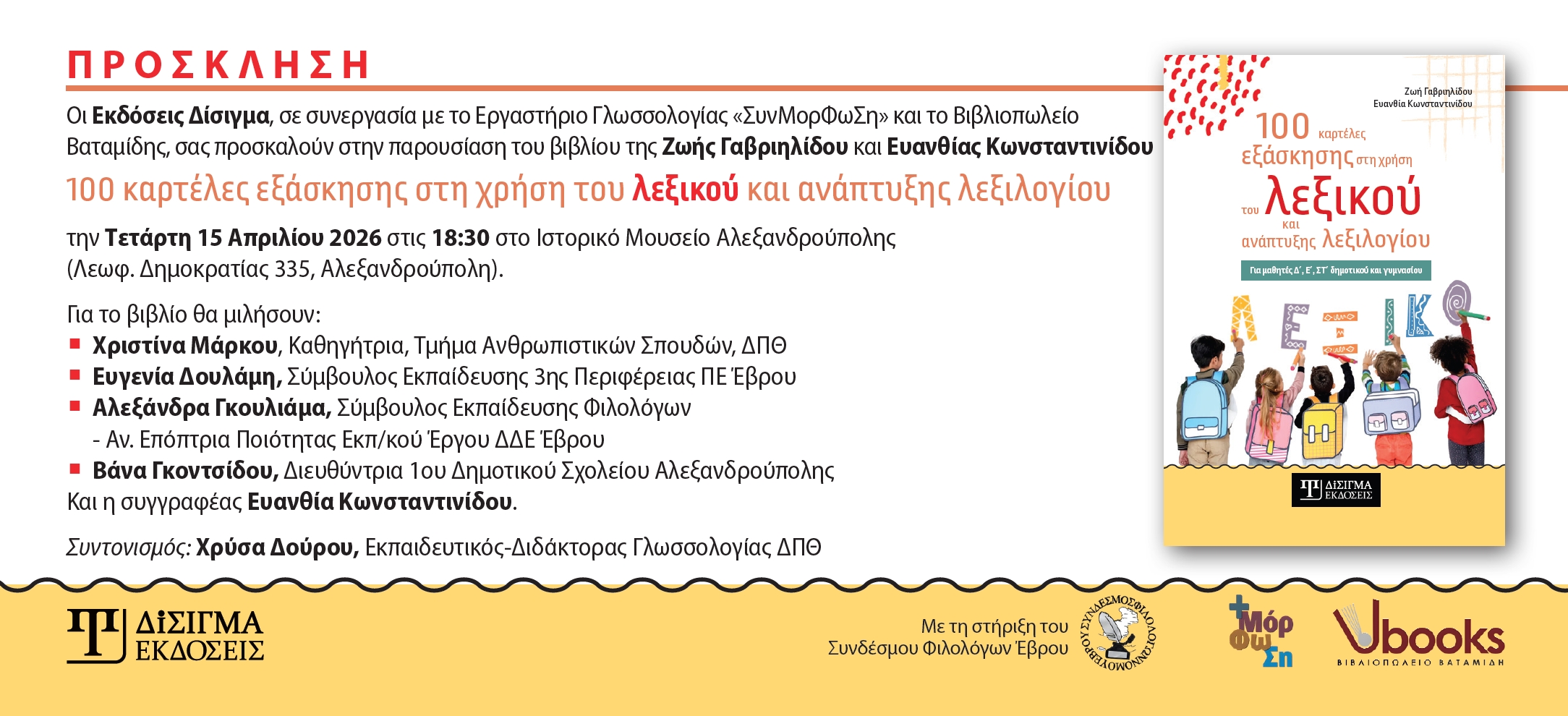 Οι Εκδόσεις Δίσιγμα, σε συνεργασία με το Εργαστήριο Γλωσσολογίας «ΣυνΜορΦωΣη» και το Βιβλιοπωλείο